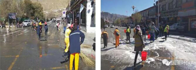 當(dāng)天11:00~17:00,我公司出動(dòng)大型灑水車2輛、人行道洗地車1輛、環(huán)衛(wèi)工人及管理人員共45人對(duì)扎寺廣場和珠峰西路(扎寺廣場至體育路路口)的路面進(jìn)行沖洗,共計(jì)出動(dòng)灑水車8車次,沖洗面積達(dá)20000平方米,耗資15000元。
