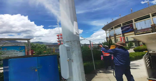 同時(shí),山南分公司還調(diào)配了15名員工、1輛高壓沖洗車、1輛灑水車、1輛洗掃車、1輛多功能沖洗車組成了體育場(chǎng)臨時(shí)清洗隊(duì),對(duì)體育場(chǎng)垃圾桶、電樁小廣告、周邊雜草以及地面等進(jìn)行了集中清理,通過(guò)采取高壓水槍沖洗和人工擦拭相結(jié)合的方式,體育場(chǎng)周圍環(huán)境及設(shè)施煥然一新,顯露“本色”。
